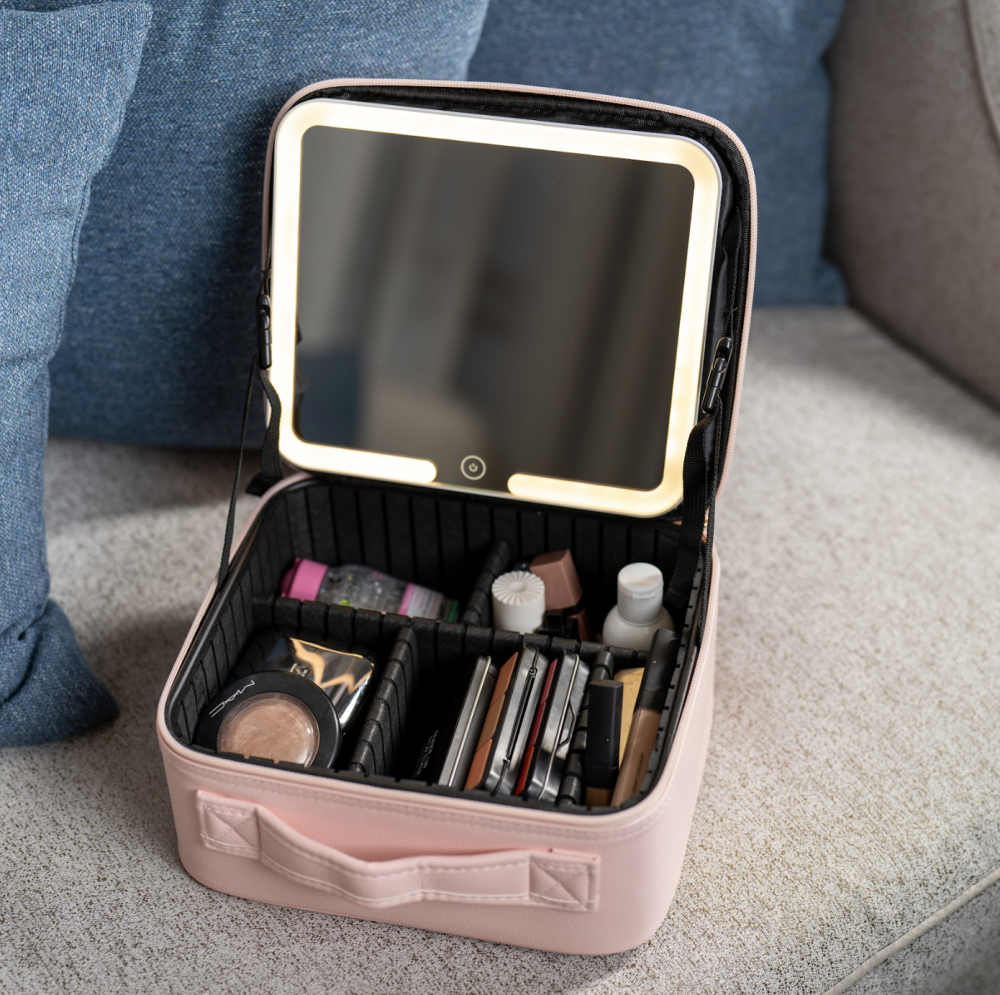 تجهيز مكياجك في إضاءة ضعيفة = كارثة. وهنا تتميز شنطة سيلو بإنارة LED قوية جدًا مع بطارية 1500mAh قابلة للشحن، تعطيك رؤية مثالية لأي مكان وزمان.